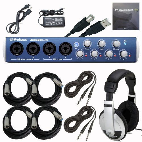 This recording bundle contains: (1) PreSonus AudioBox 44 VSL Advanced 4x4 USB 2.0 Recording Interface, (1) Pair of Closed-Back Stereo Headphones to monitor your recordings, (4) 20 ft XLR cables to connect four microphones to the AudioBox 44 VSL, and (2) 15 ft TRS cables for additional line in/line out connectivity.